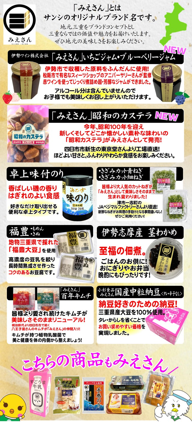 サンシオリジナルブランド みえさんのご紹介 2025-11-01 店舗よりいくわ店こもの繁盛店サンビーム店みえ川越インター店みその店(ベリー)一番街店亀山エコー店大矢知店小俣店(ベリー)日永カヨー店明和店桑名店桜花台店河芸店藤里店(ベリー)鈴鹿ハンター店