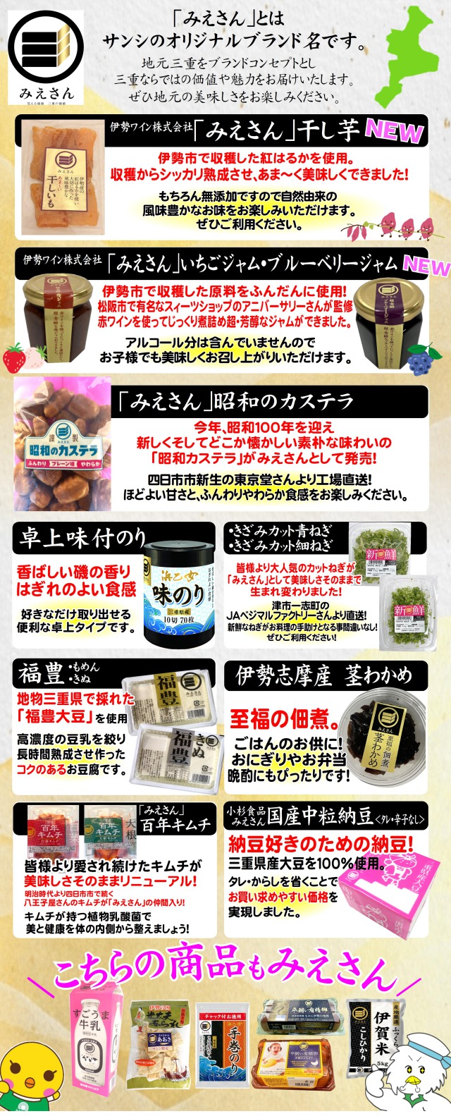サンシオリジナルブランド みえさんのご紹介 2025-11-17 店舗よりいくわ店こもの繁盛店サンビーム店みえ川越インター店みその店(ベリー)一番街店亀山エコー店大矢知店小俣店(ベリー)日永カヨー店明和店桑名店桜花台店河芸店藤里店(ベリー)鈴鹿ハンター店
